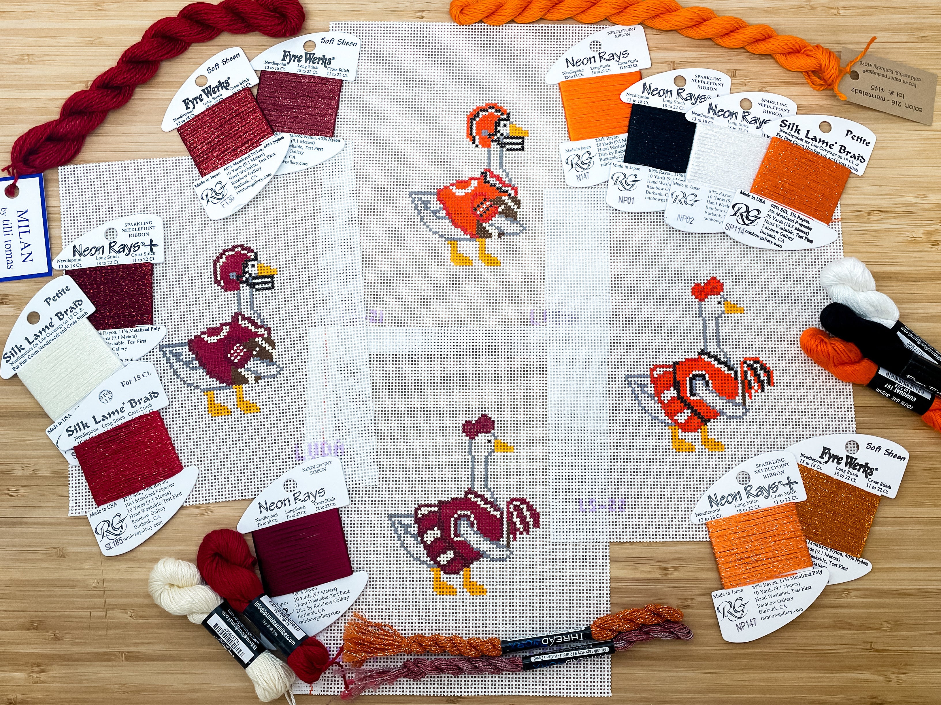 Celebrate the season with needlepoint geese dressed for game day.